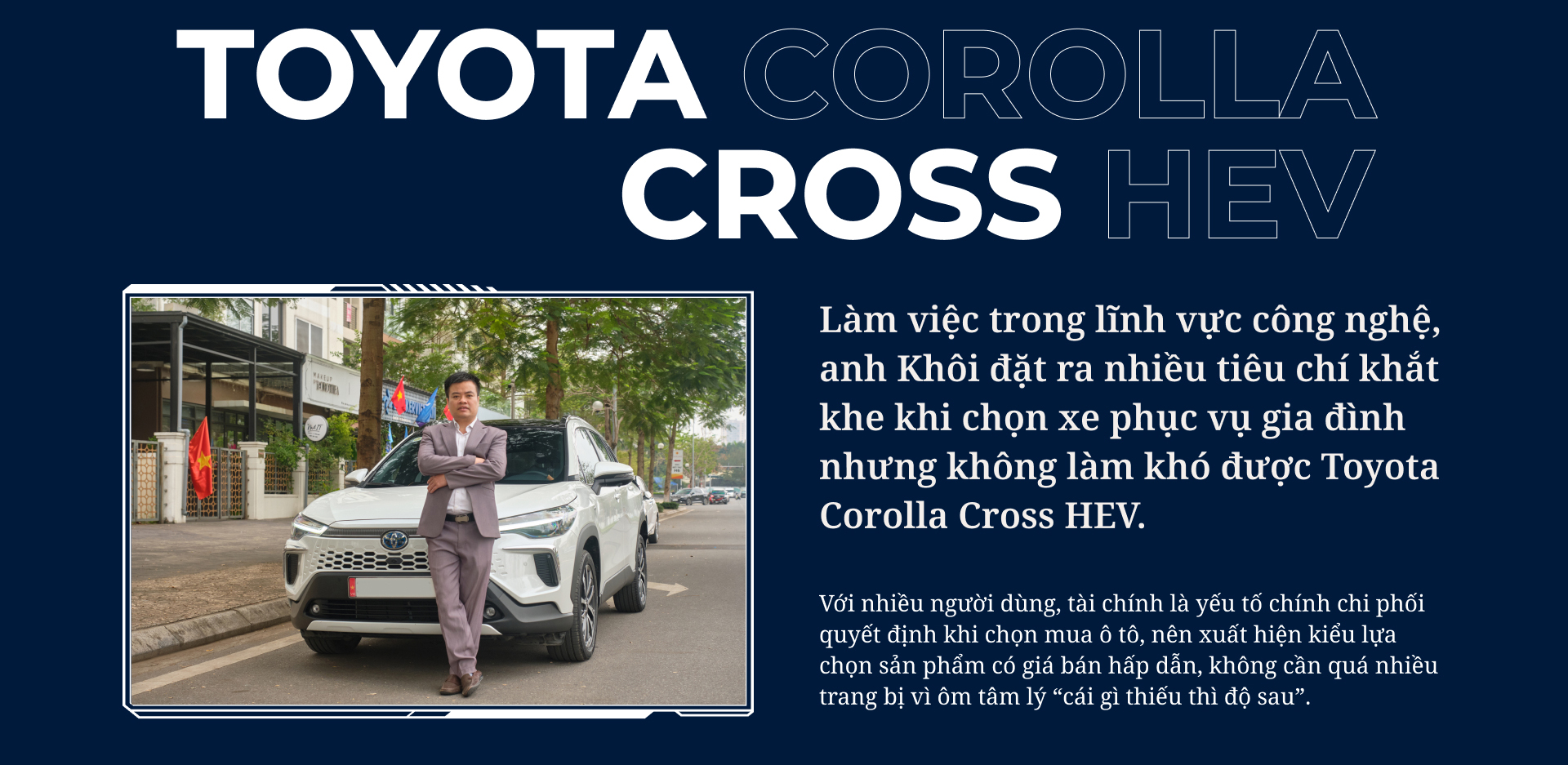 “Toyota là hãng xe uy tín, đã đặt nền móng hơn 30 năm phát triển tại Việt Nam, đã được “thử lửa” rất lâu rồi mới tồn tại được. Tôi thấy họ đã nghiên cứu rất kỹ thị trường rồi mới đem Toyota Corolla Cross HEV về, nên tôi hoàn toàn yên tâm khi lựa chọn mẫu xe này”, anh Khôi nhấn mạnh.
